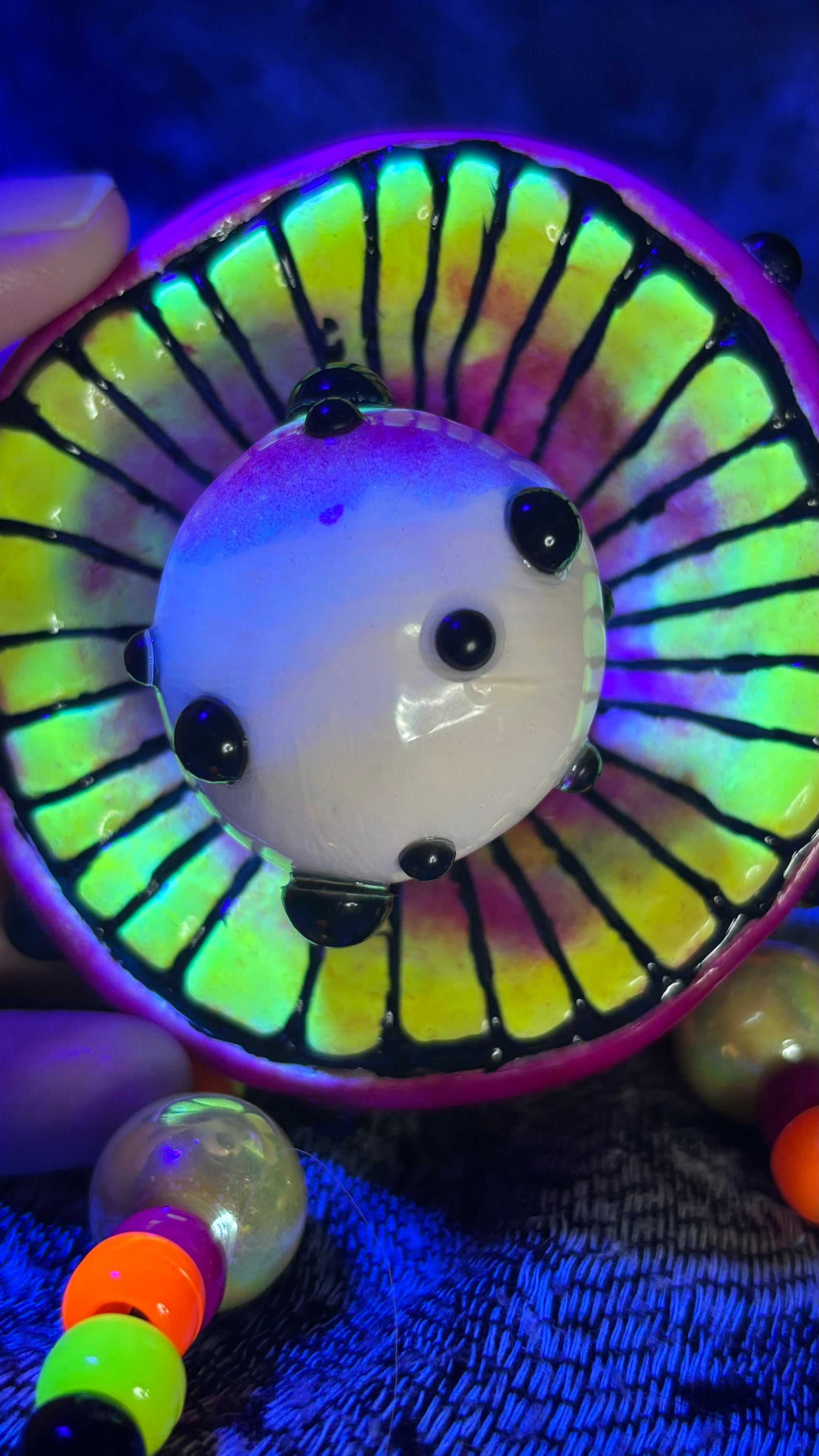 Hand sculpted out of polymer clay, painted with blacklight paints and sealed with UV Resin. The dots on this mushroom change color when warmed up, from black to yellow when warmer.