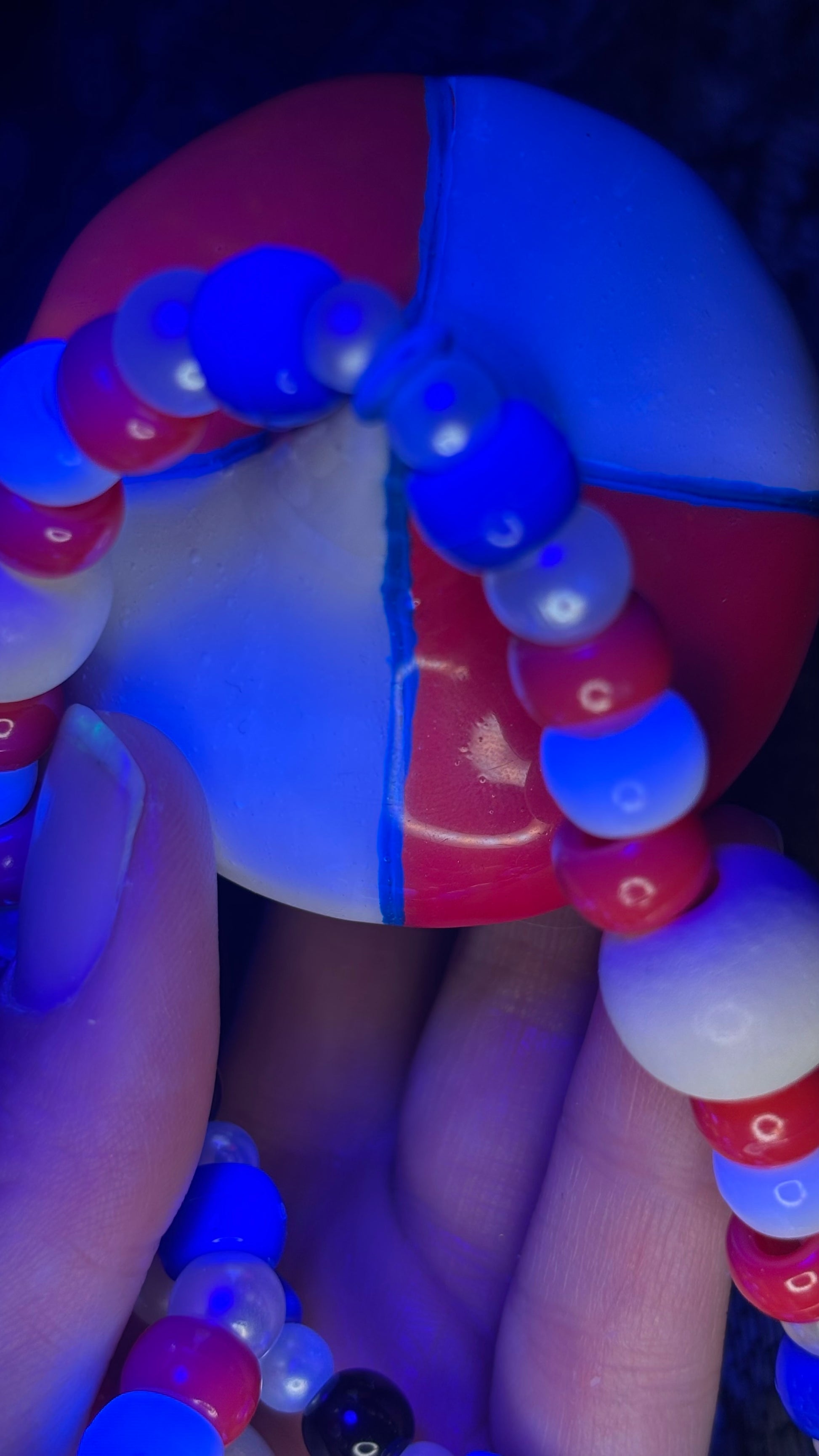 Hand sculpted out of polymer clay, painted with blacklight paints and sealed with UV Resin.