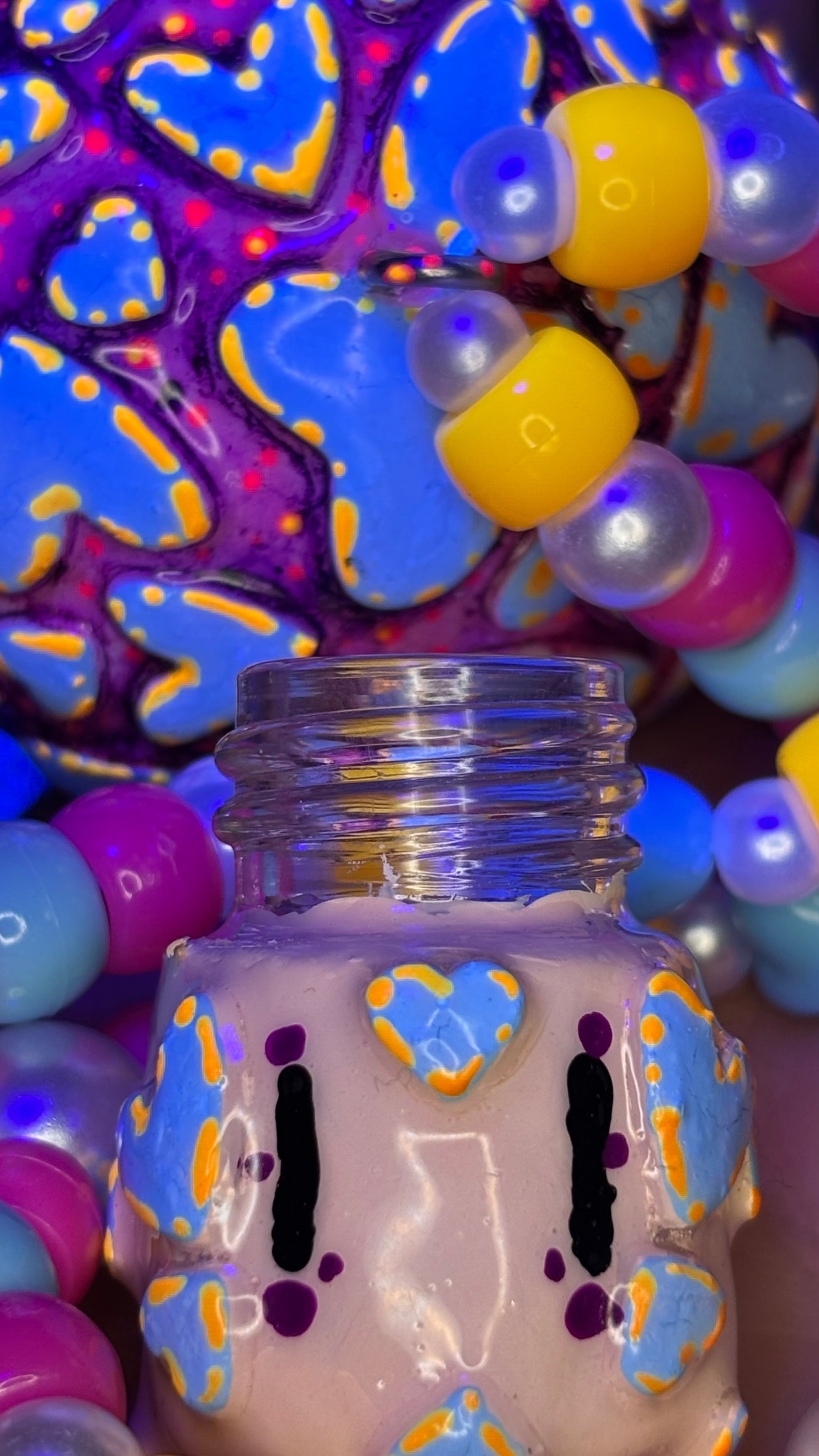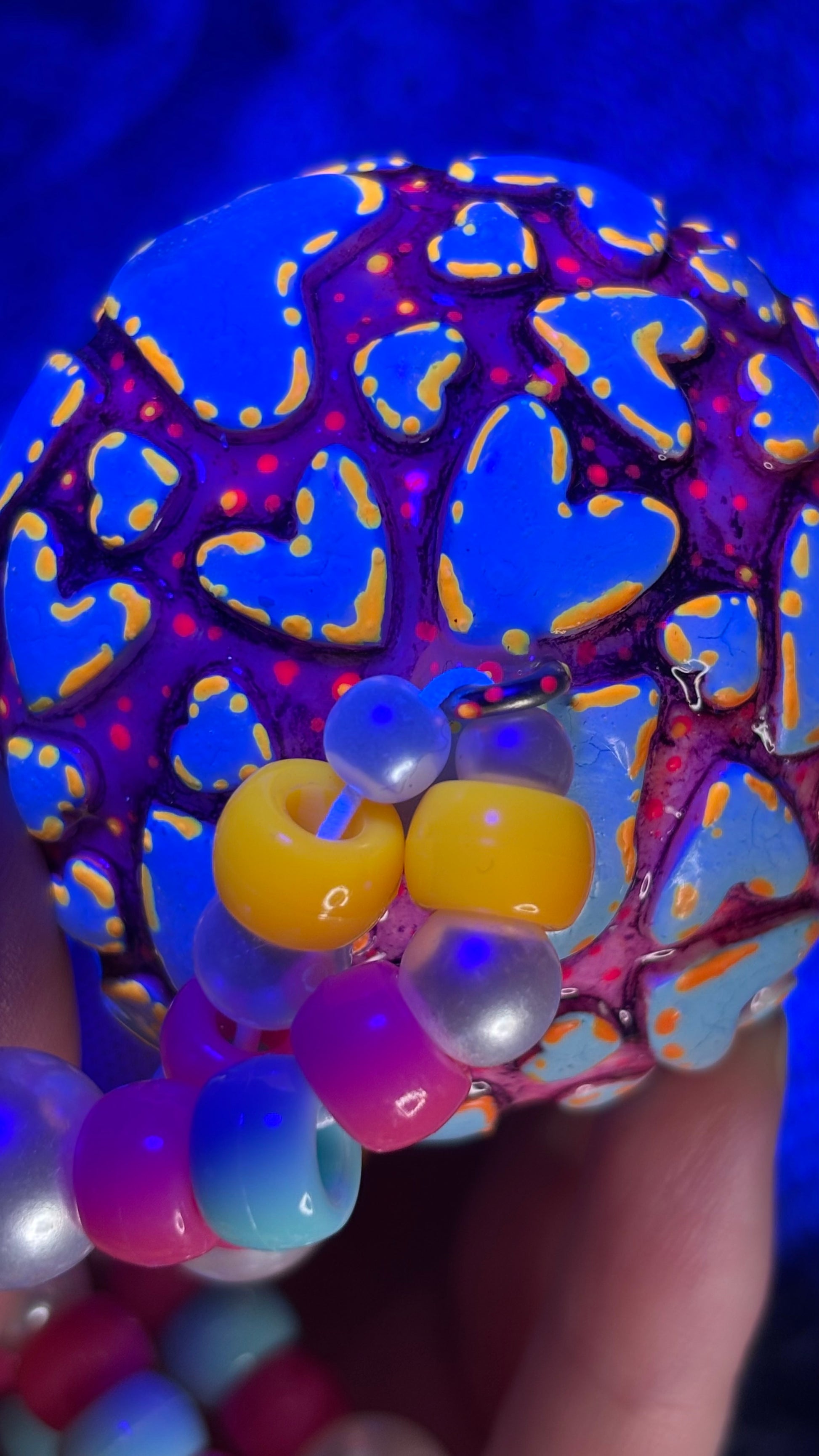 Hand sculpted out of polymer clay, painted with blacklight paints and sealed with UV Resin.