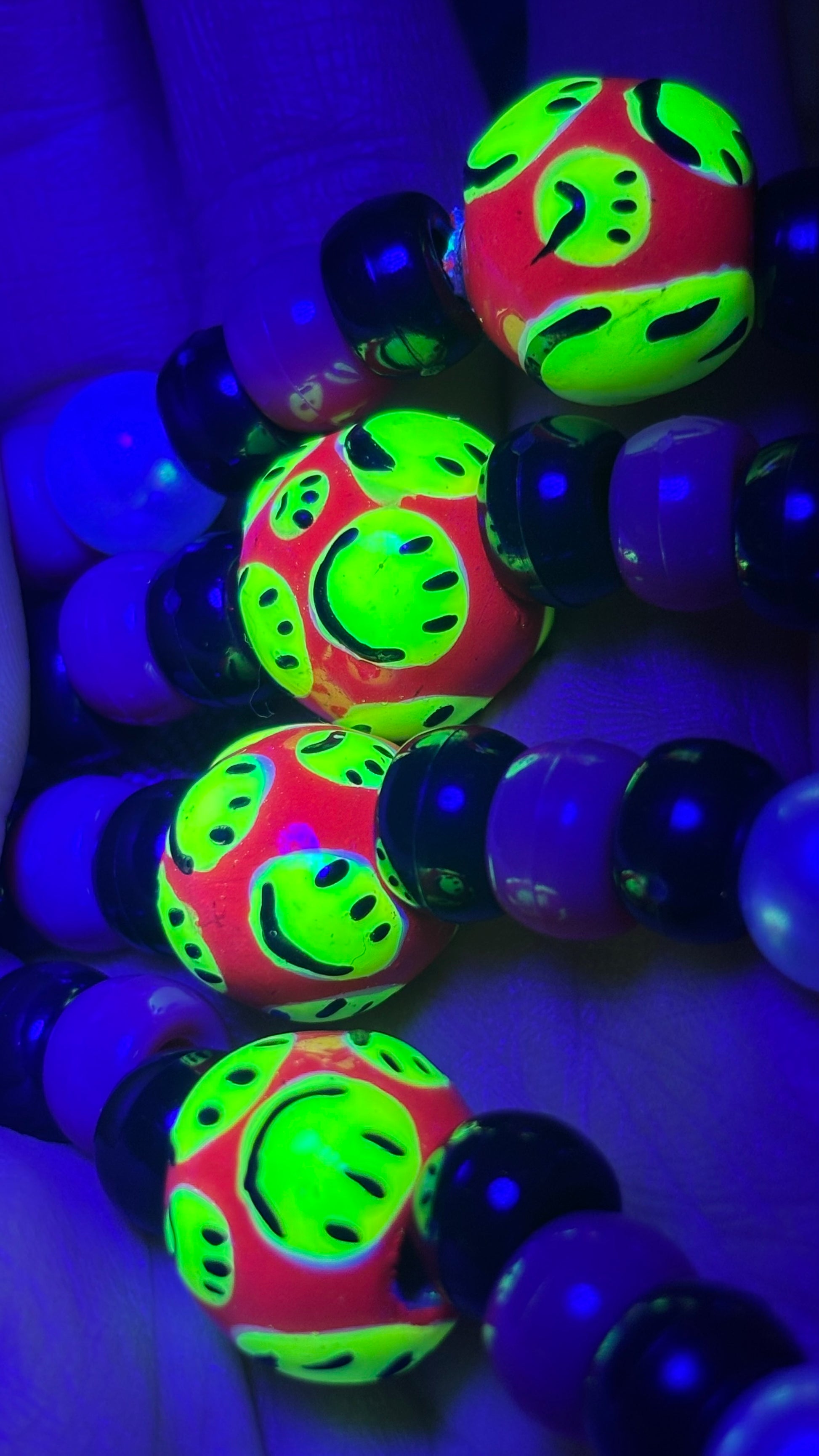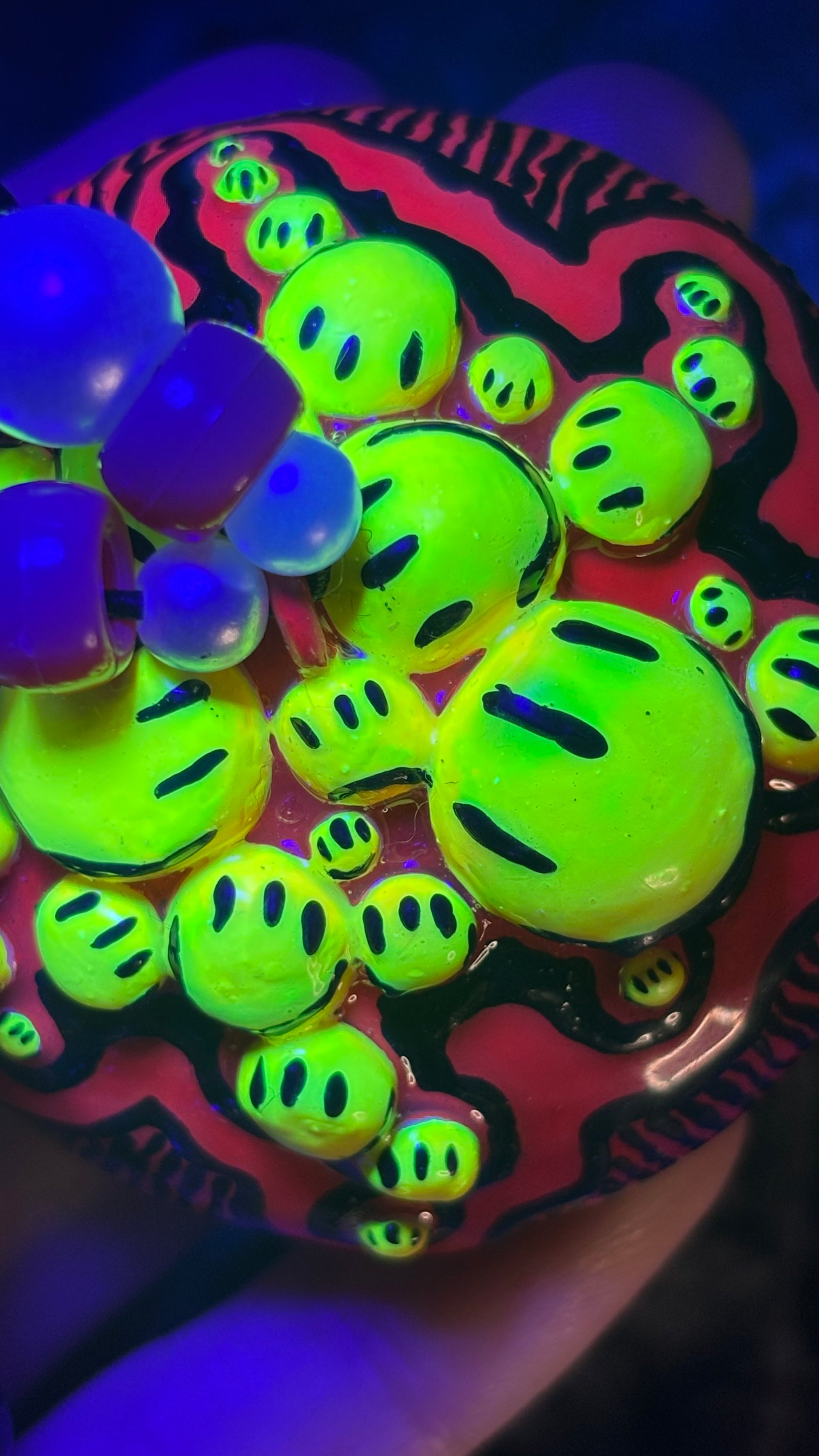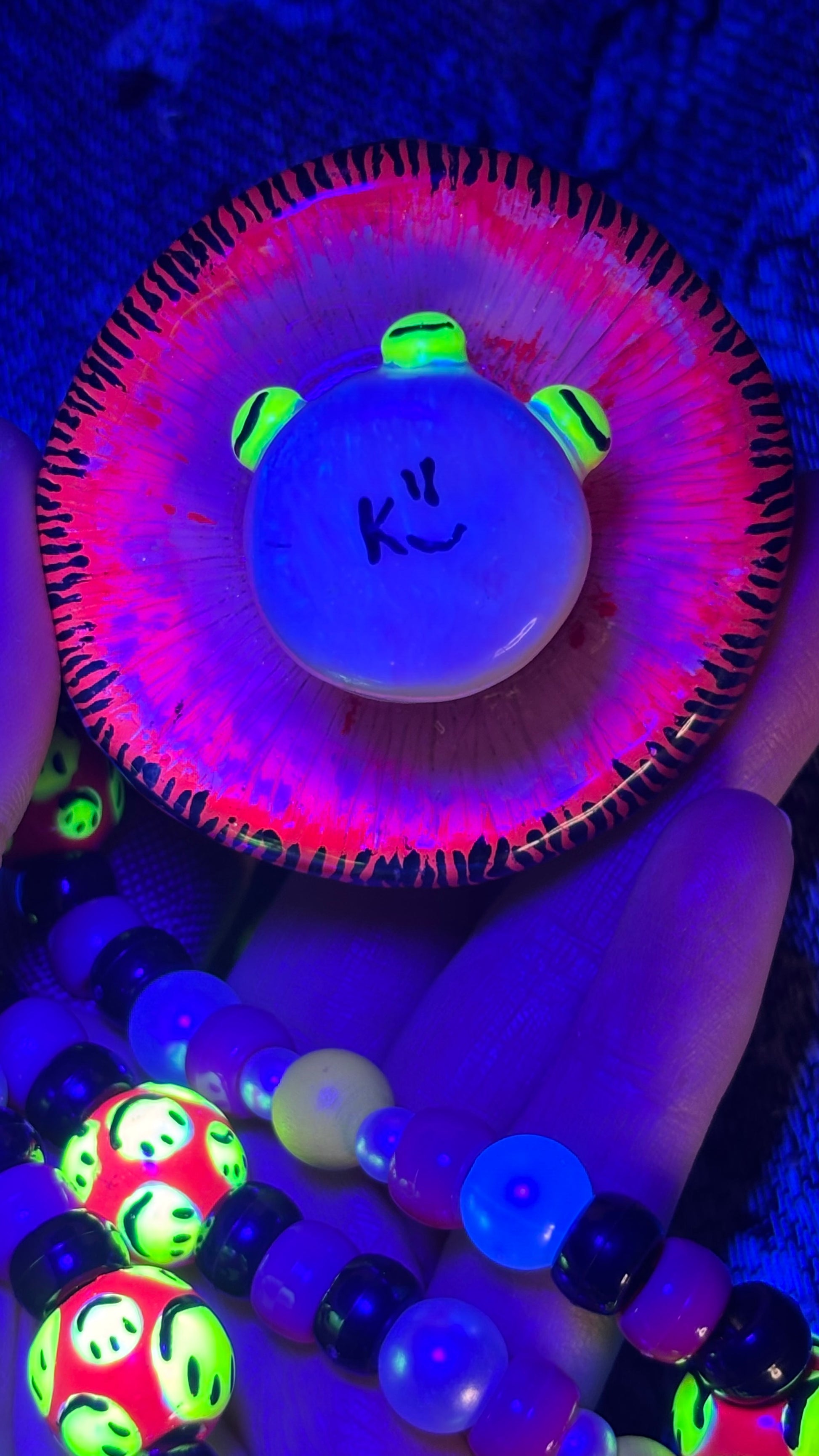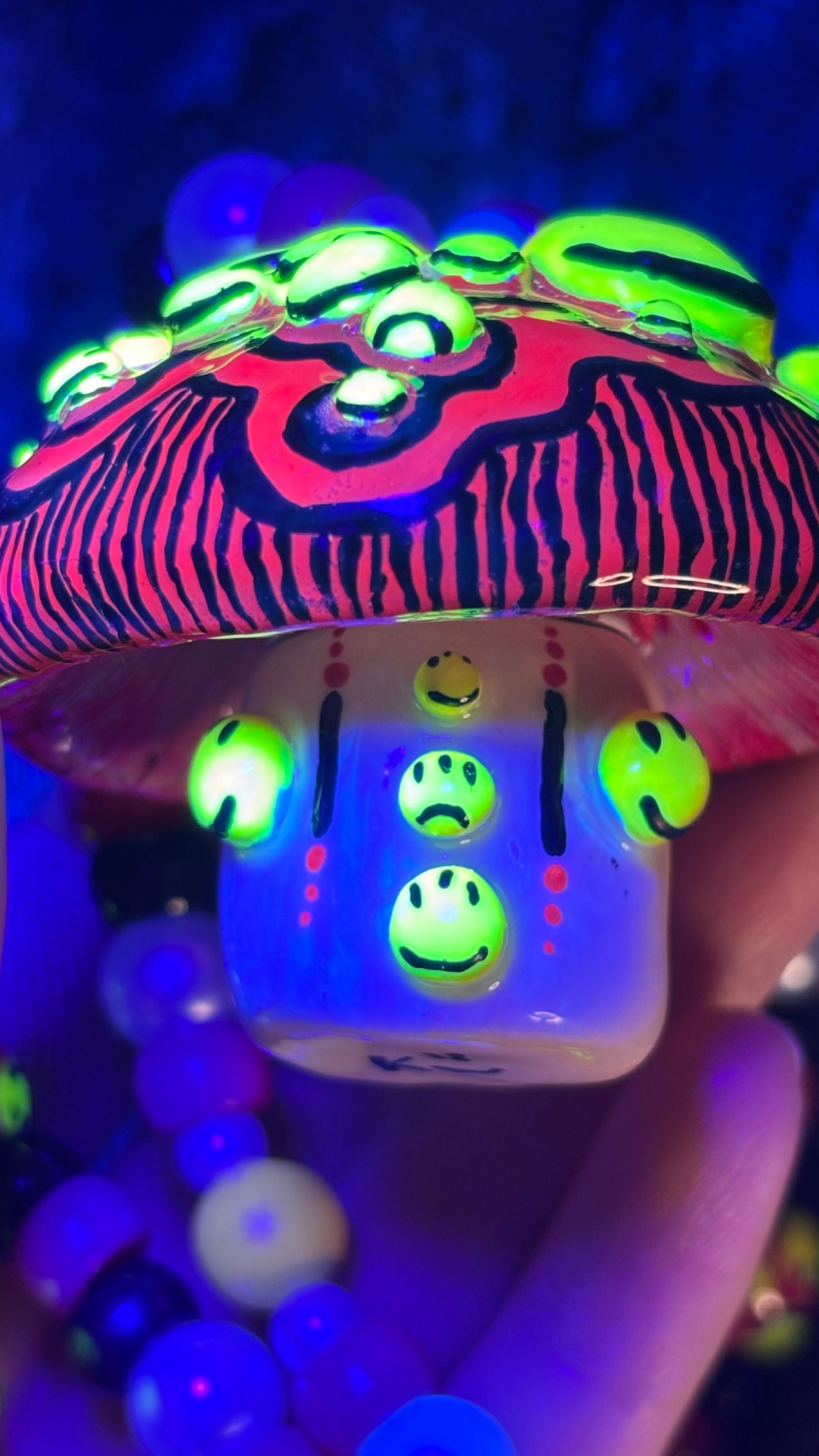 Hand sculpted out of polymer clay, painted with blacklight paints and sealed with UV Resin. Includes custom hand painted wooden beads with this stash jar.