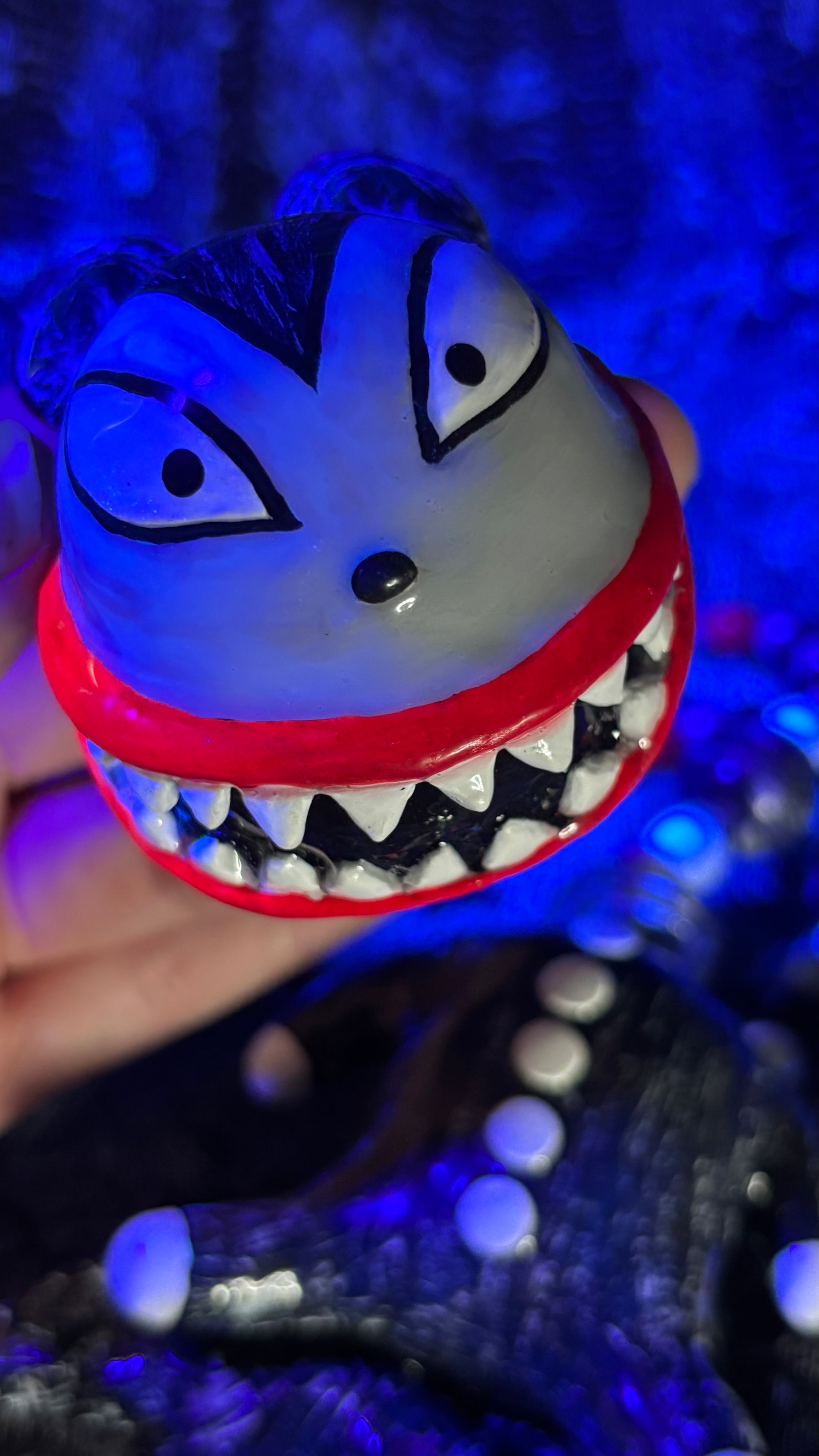 Hand sculpted out of polymer clay, painted with blacklight paints and sealed with UV Resin. Includes custom hand painted wooden beads with this stash jar.