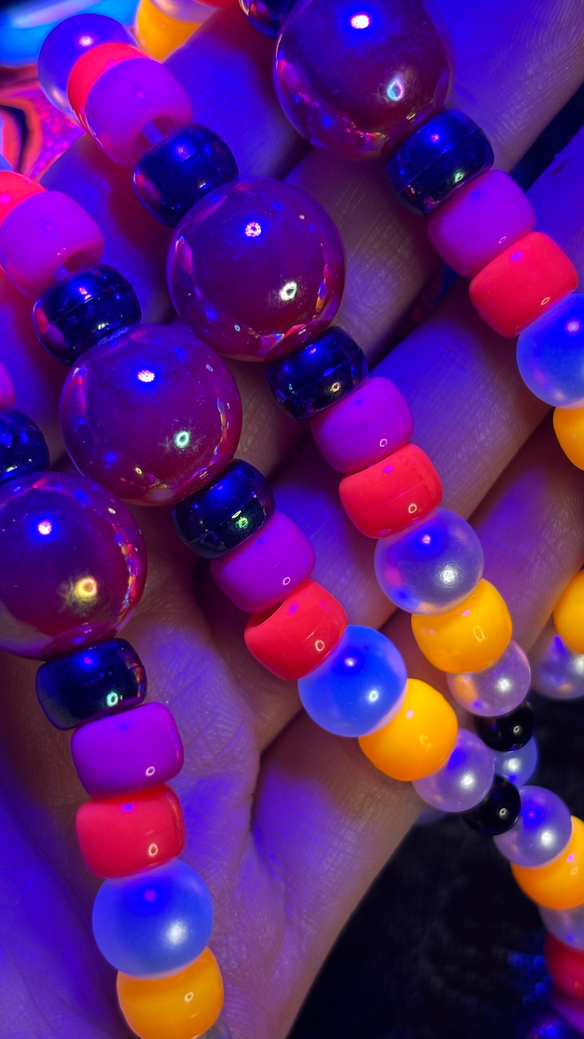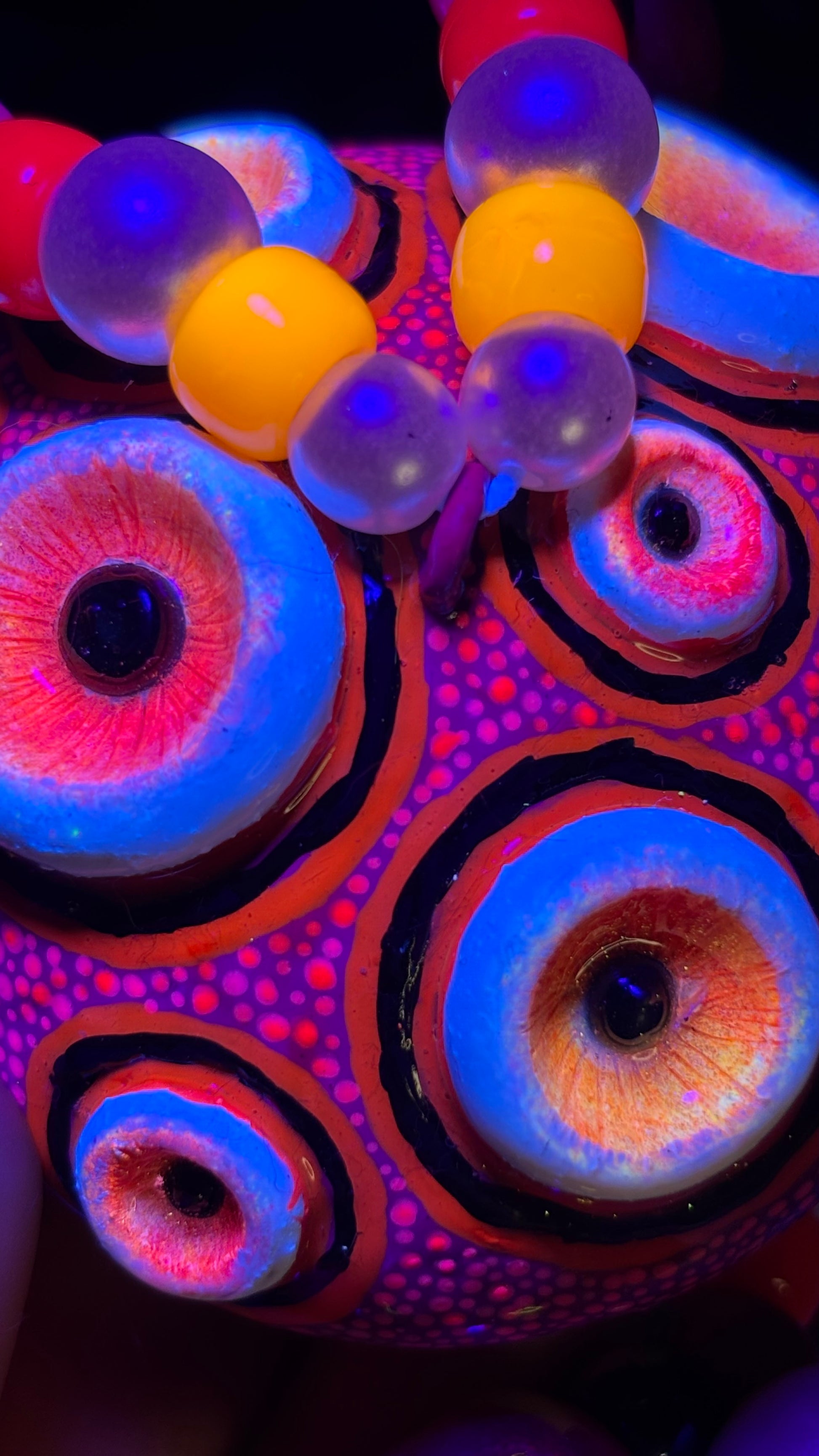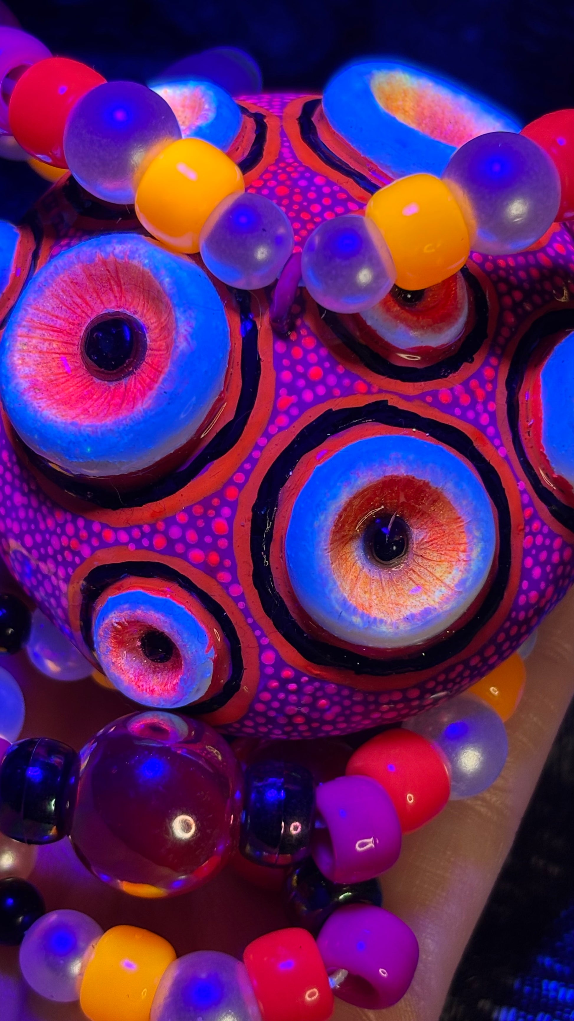 Hand sculpted out of polymer clay, painted with blacklight paints and sealed with UV Resin.