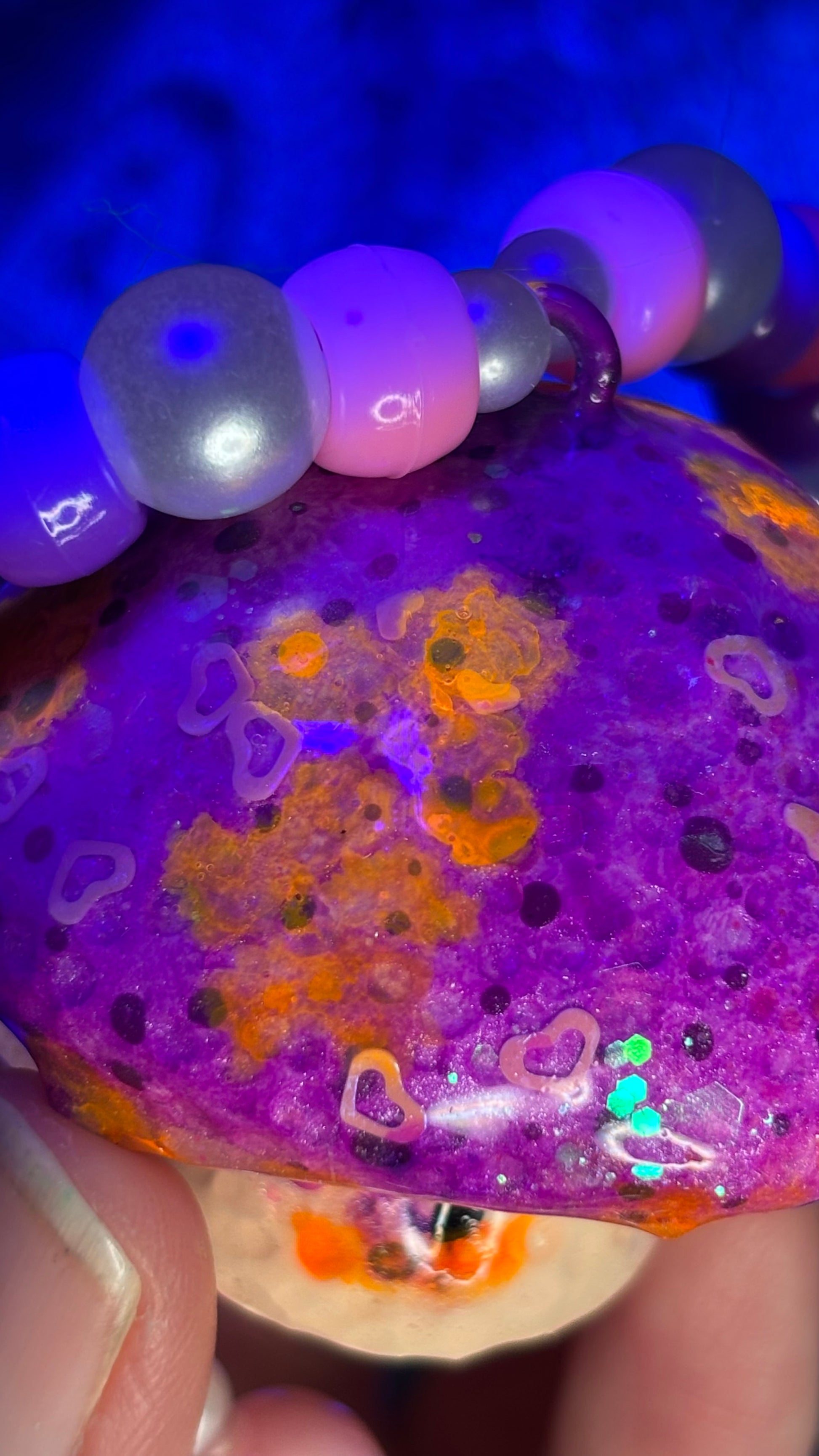 Hand sculpted out of polymer clay, painted with blacklight paints and sealed with UV Resin.