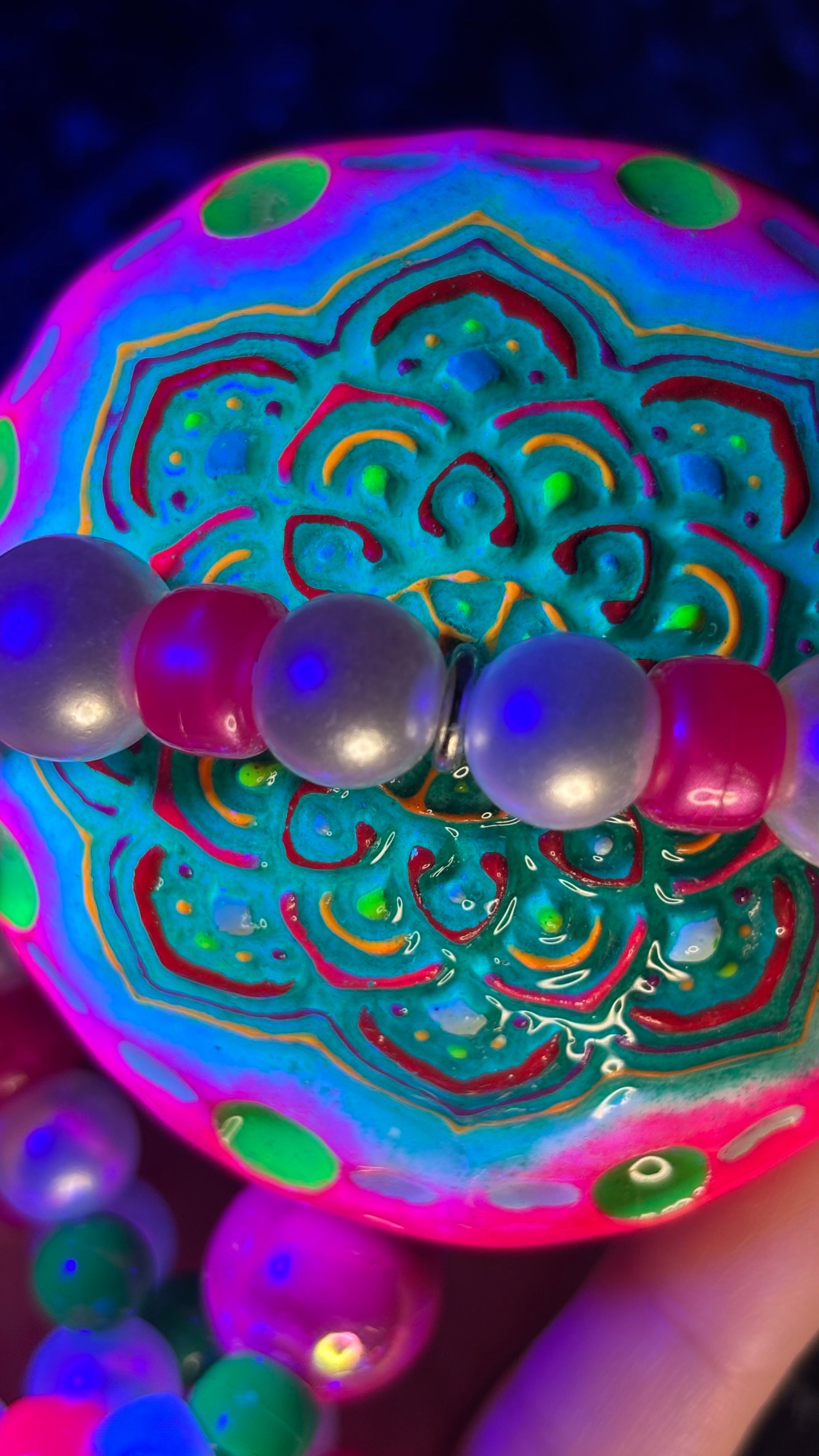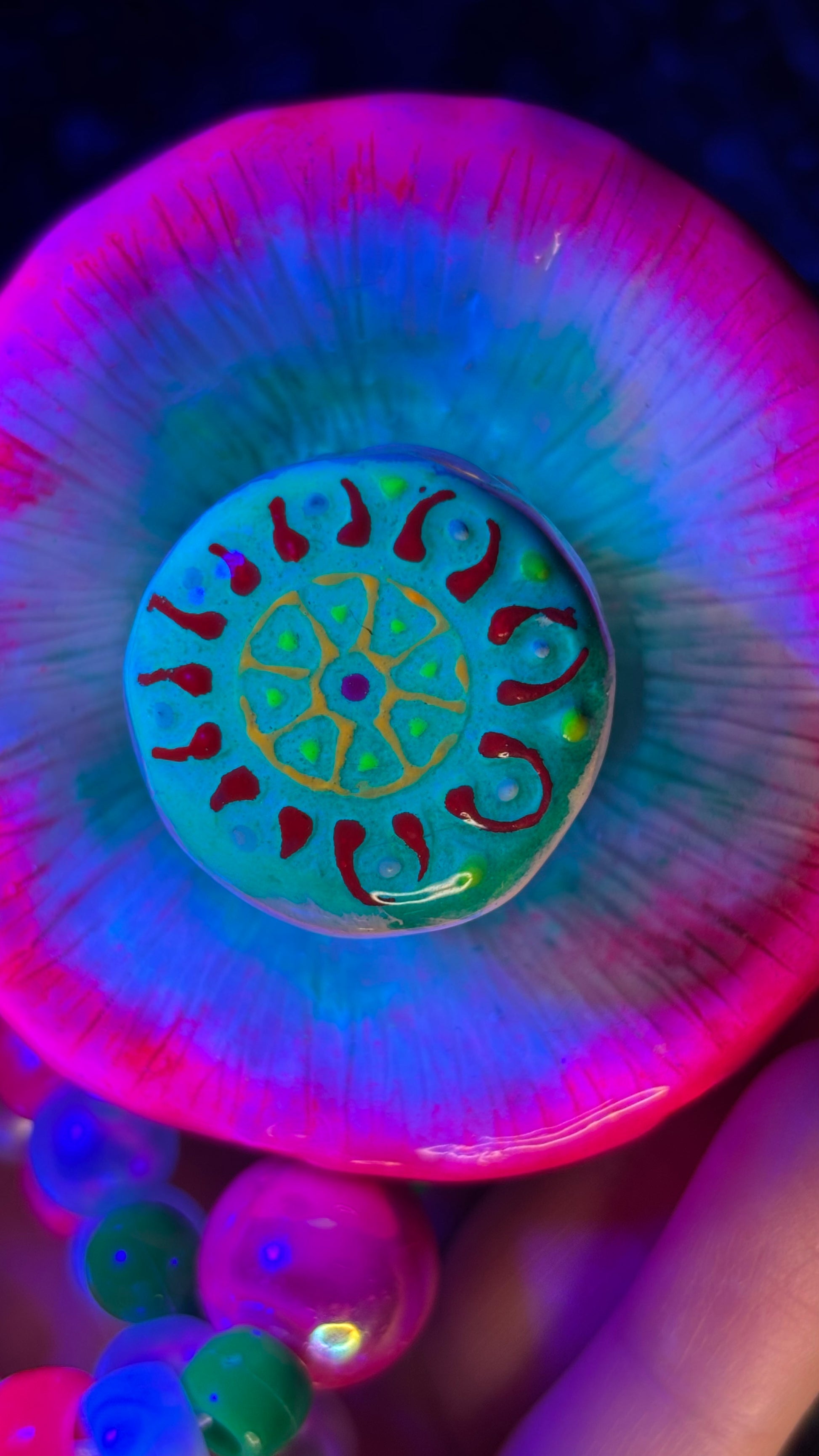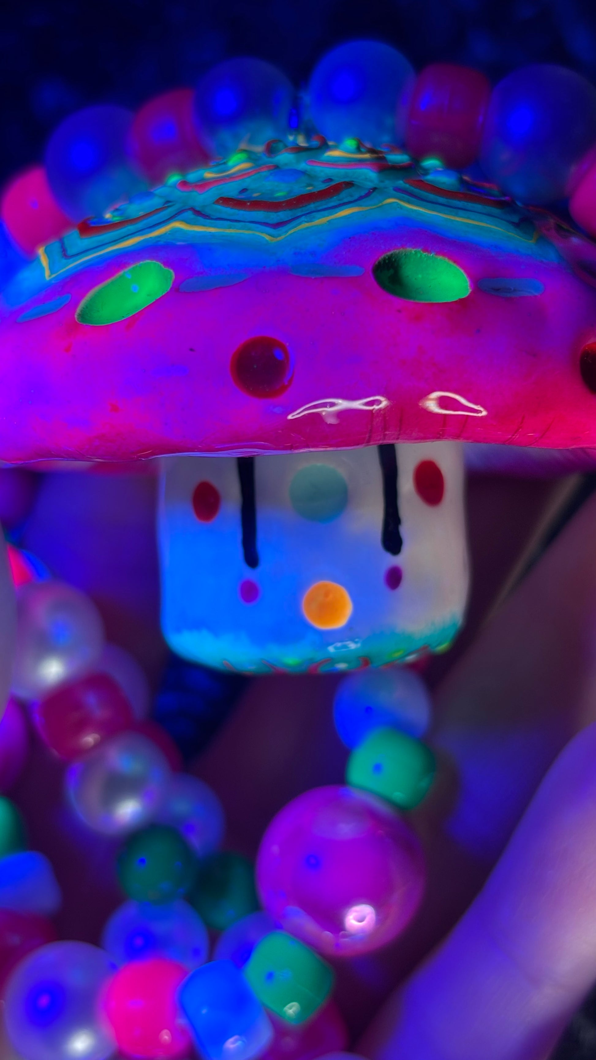 Hand sculpted out of polymer clay, painted with blacklight paints and sealed with UV Resin.