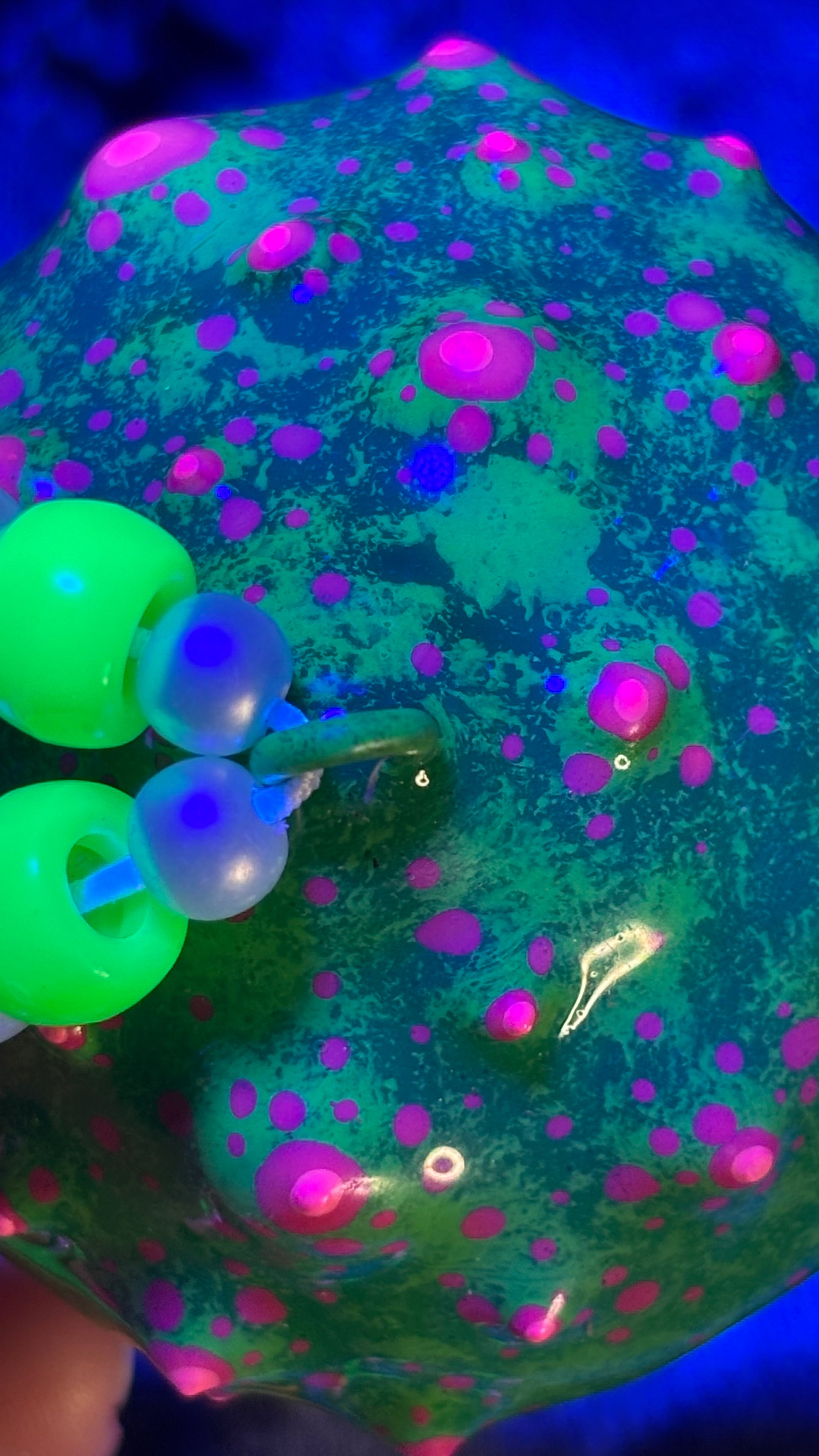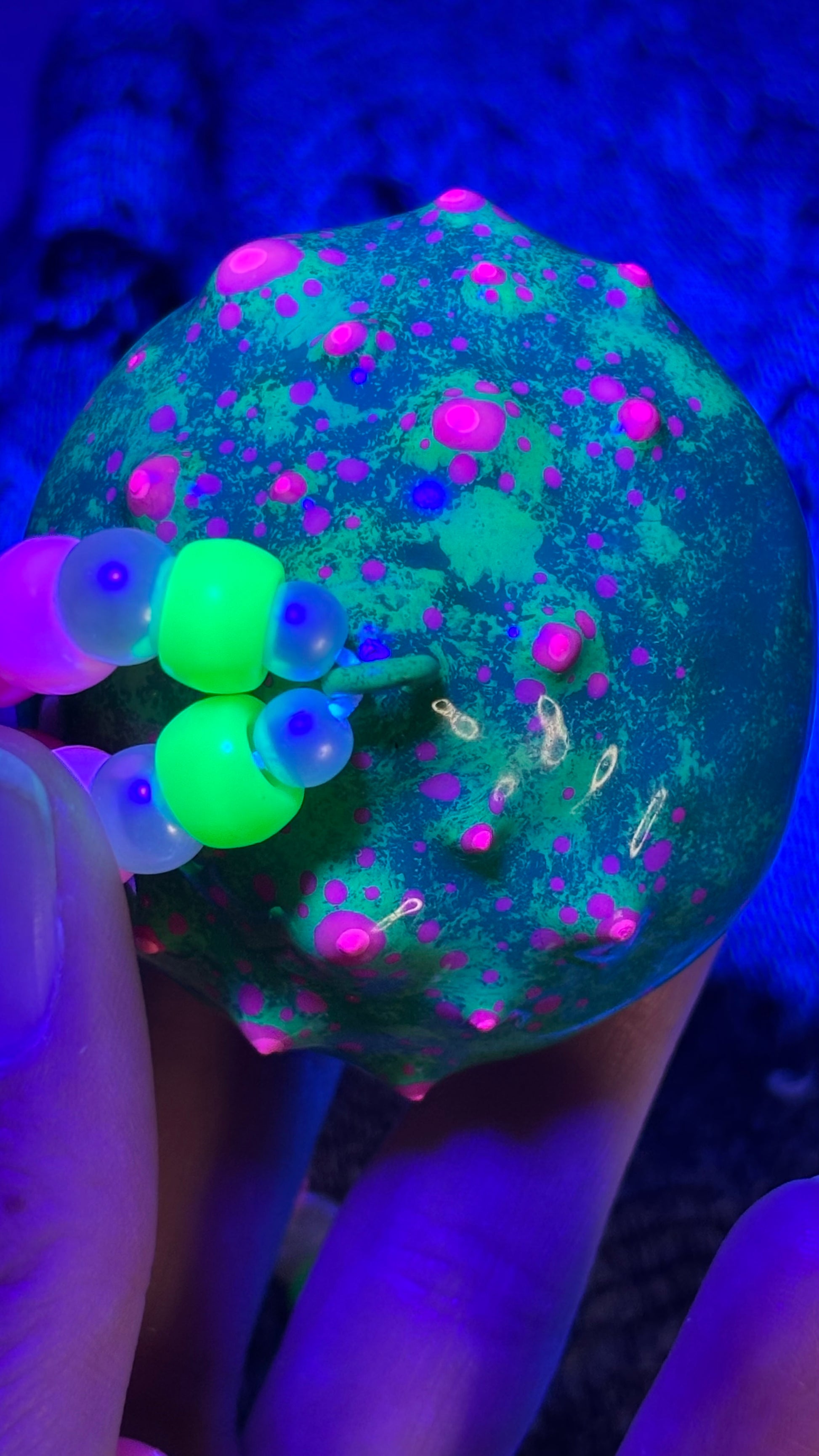 Hand sculpted out of polymer clay, painted with blacklight paints and sealed with UV Resin.