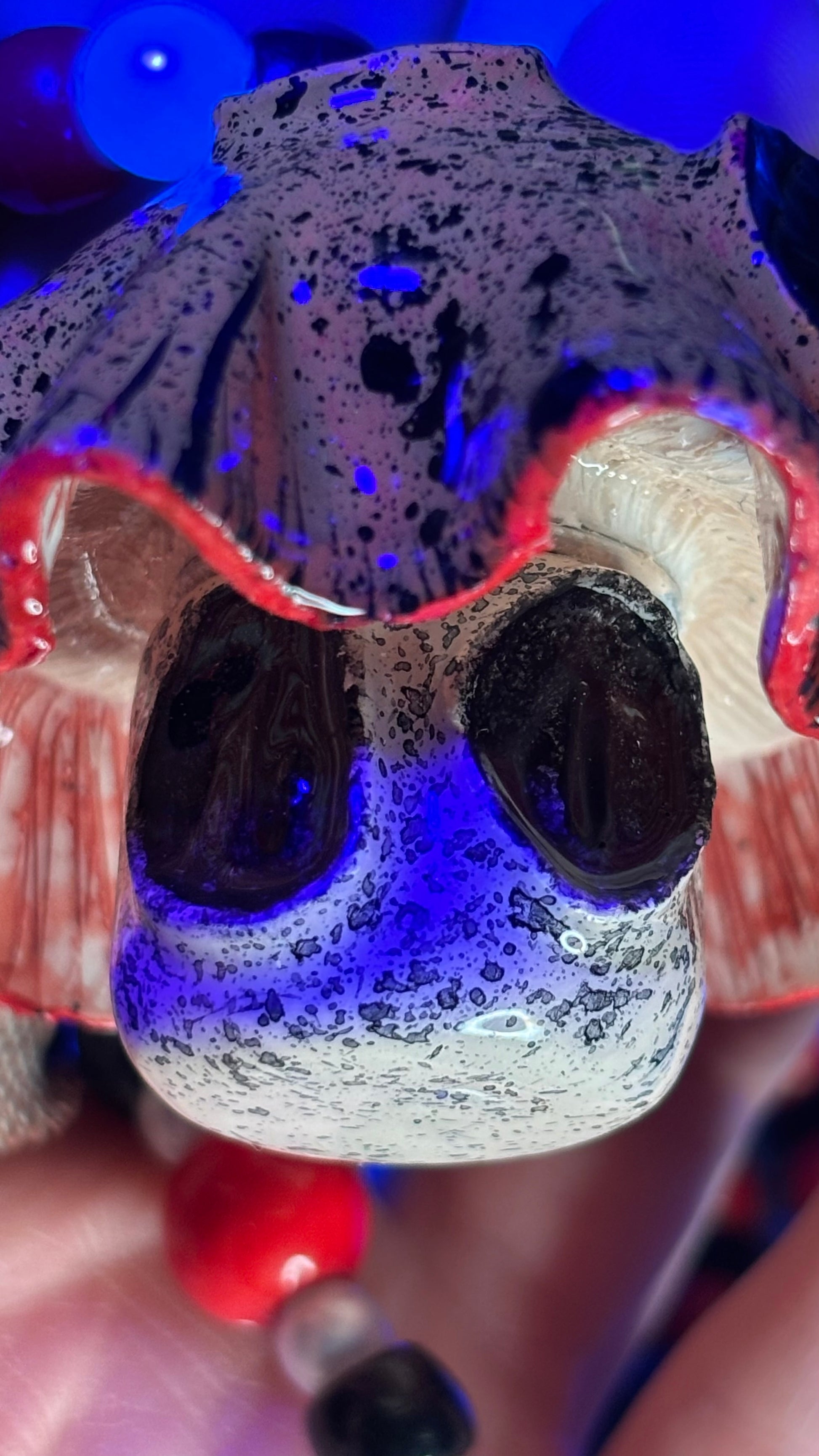 Hand sculpted out of polymer clay, painted with blacklight paints and sealed with UV Resin.