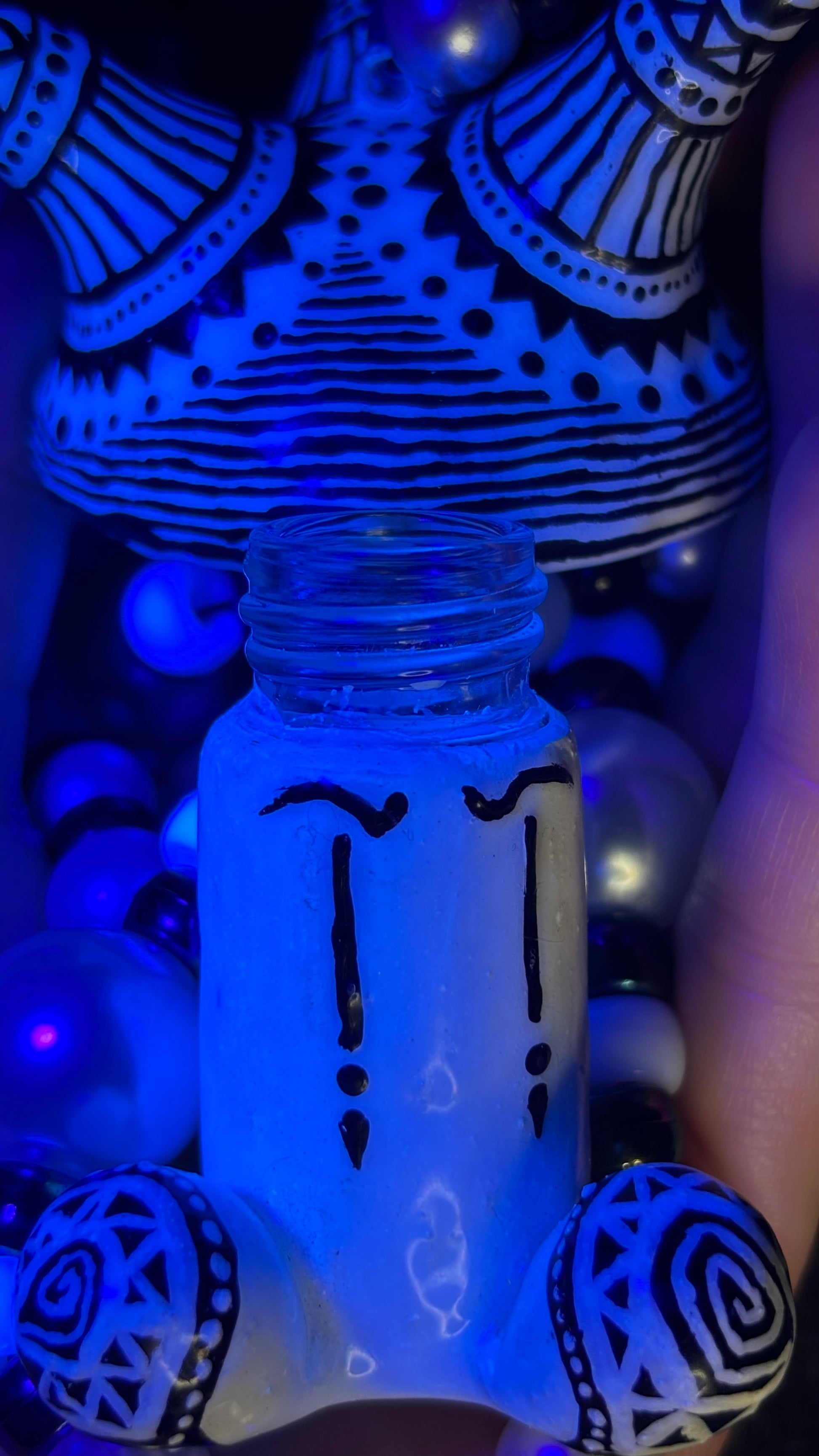 Hand sculpted out of polymer clay, painted with blacklight paints and sealed with UV Resin.