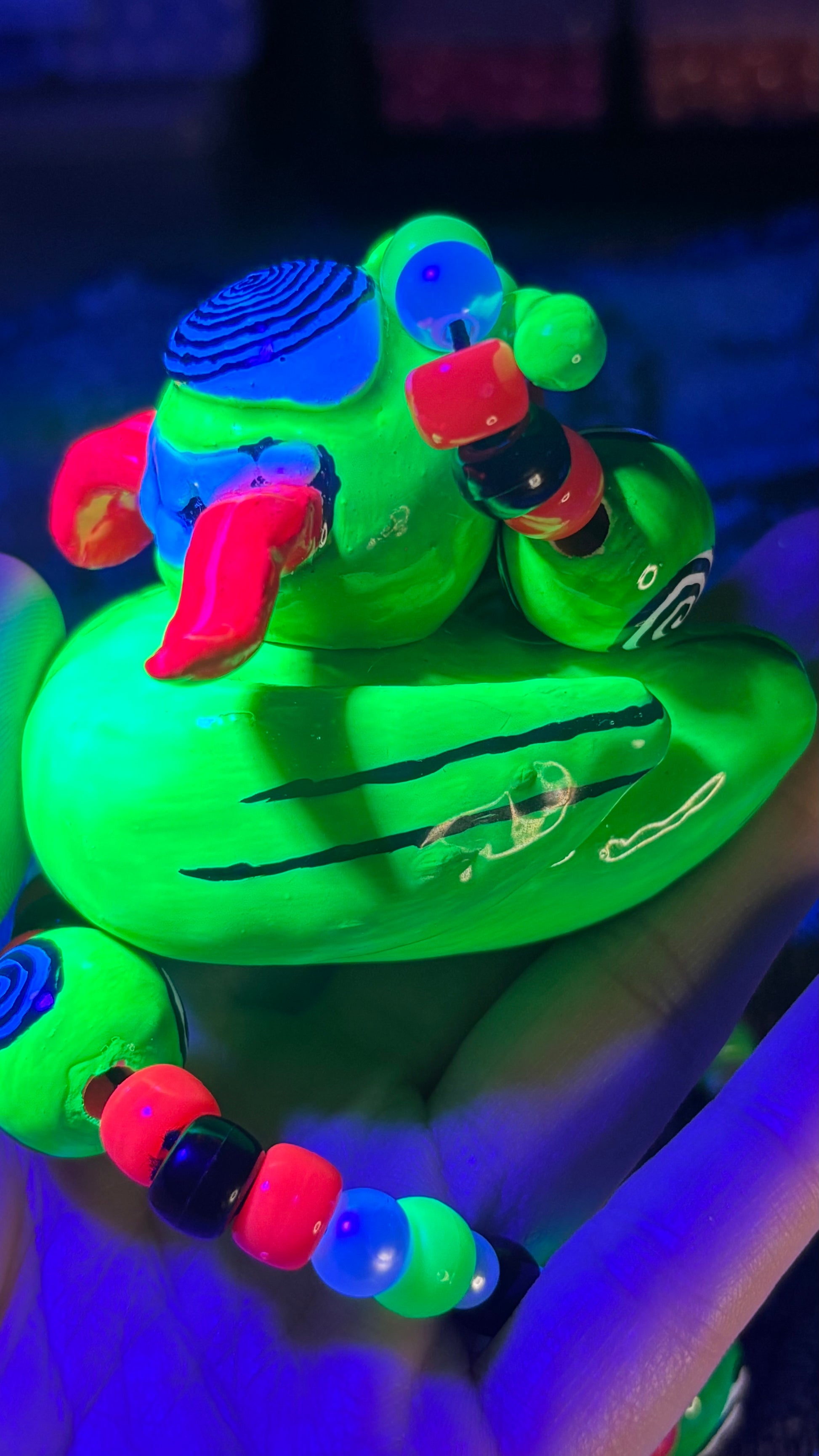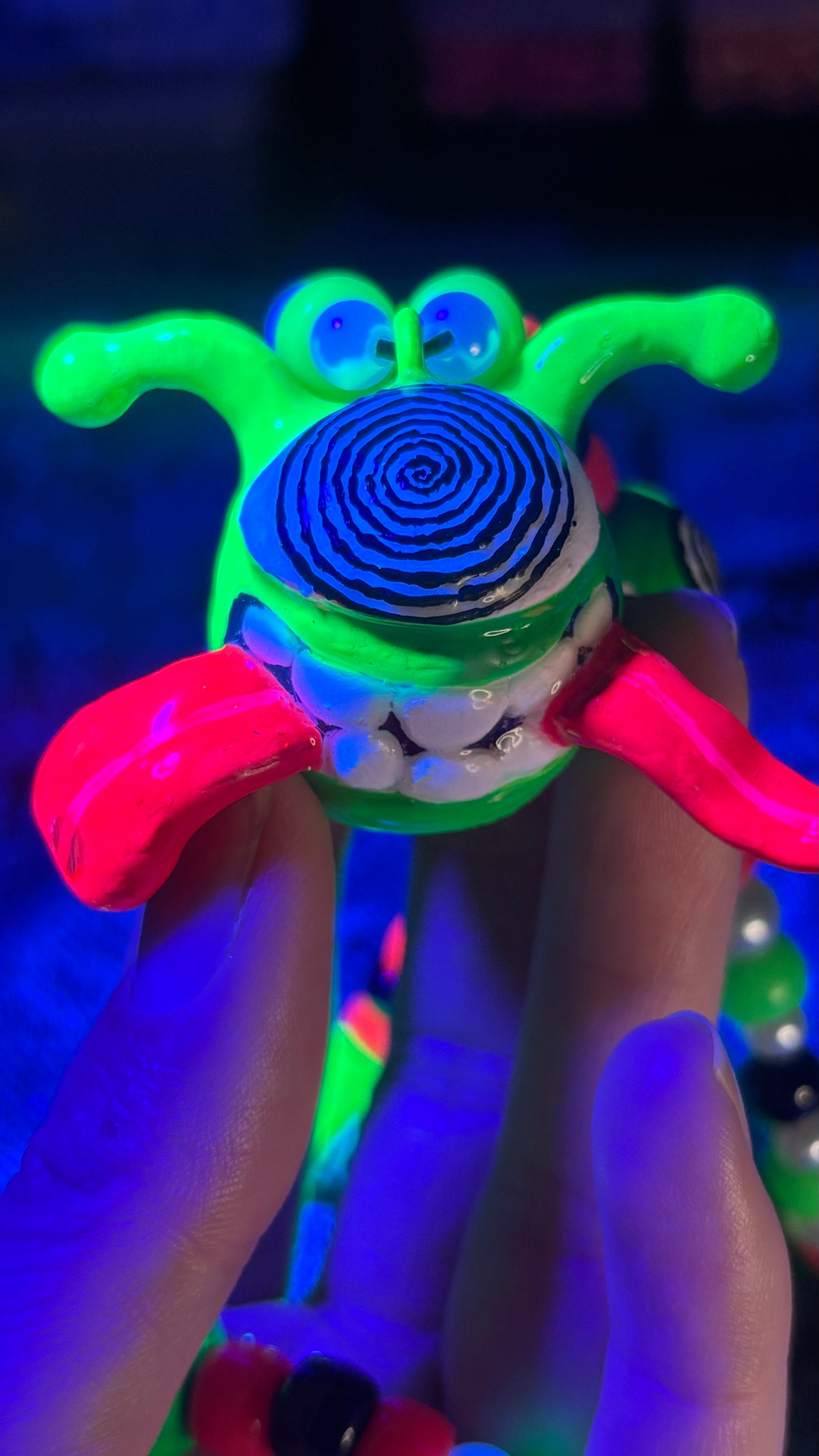 Hand sculpted out of polymer clay, painted with blacklight paints and sealed with UV Resin. This creation is a one of a kind creation of mine. π₯°π«Άπ»