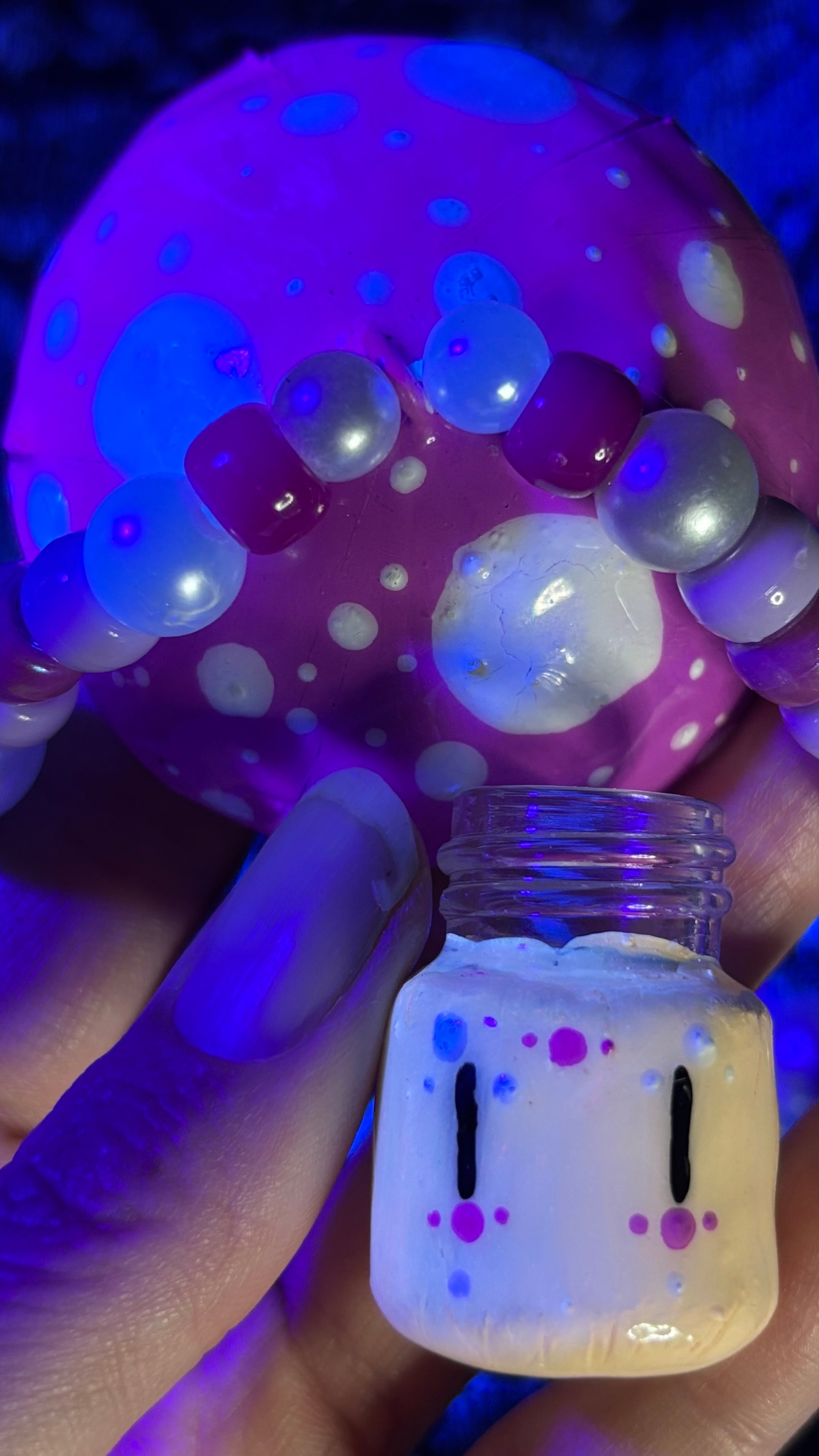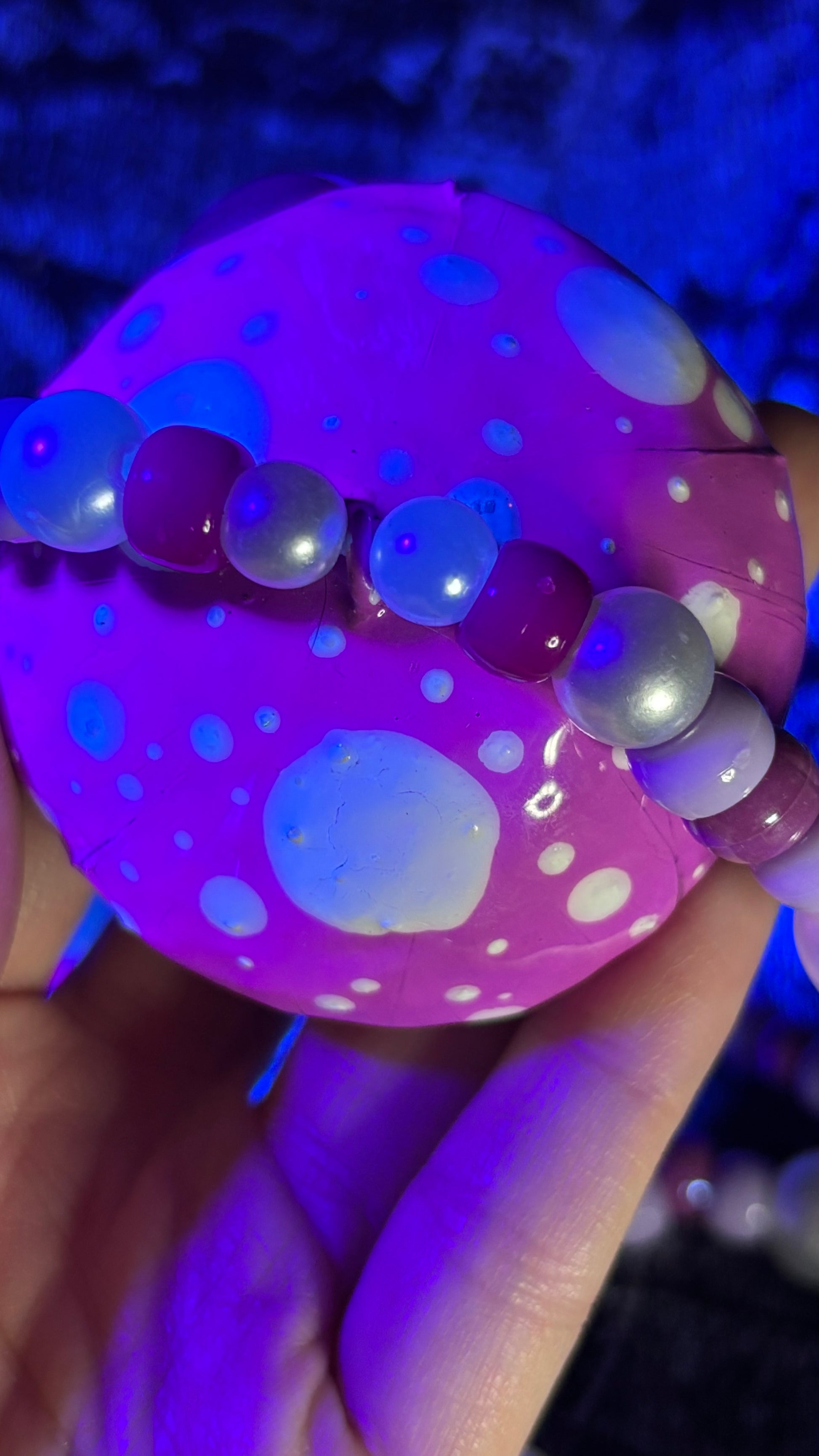 Hand sculpted out of polymer clay, painted with blacklight paints and sealed with UV Resin.