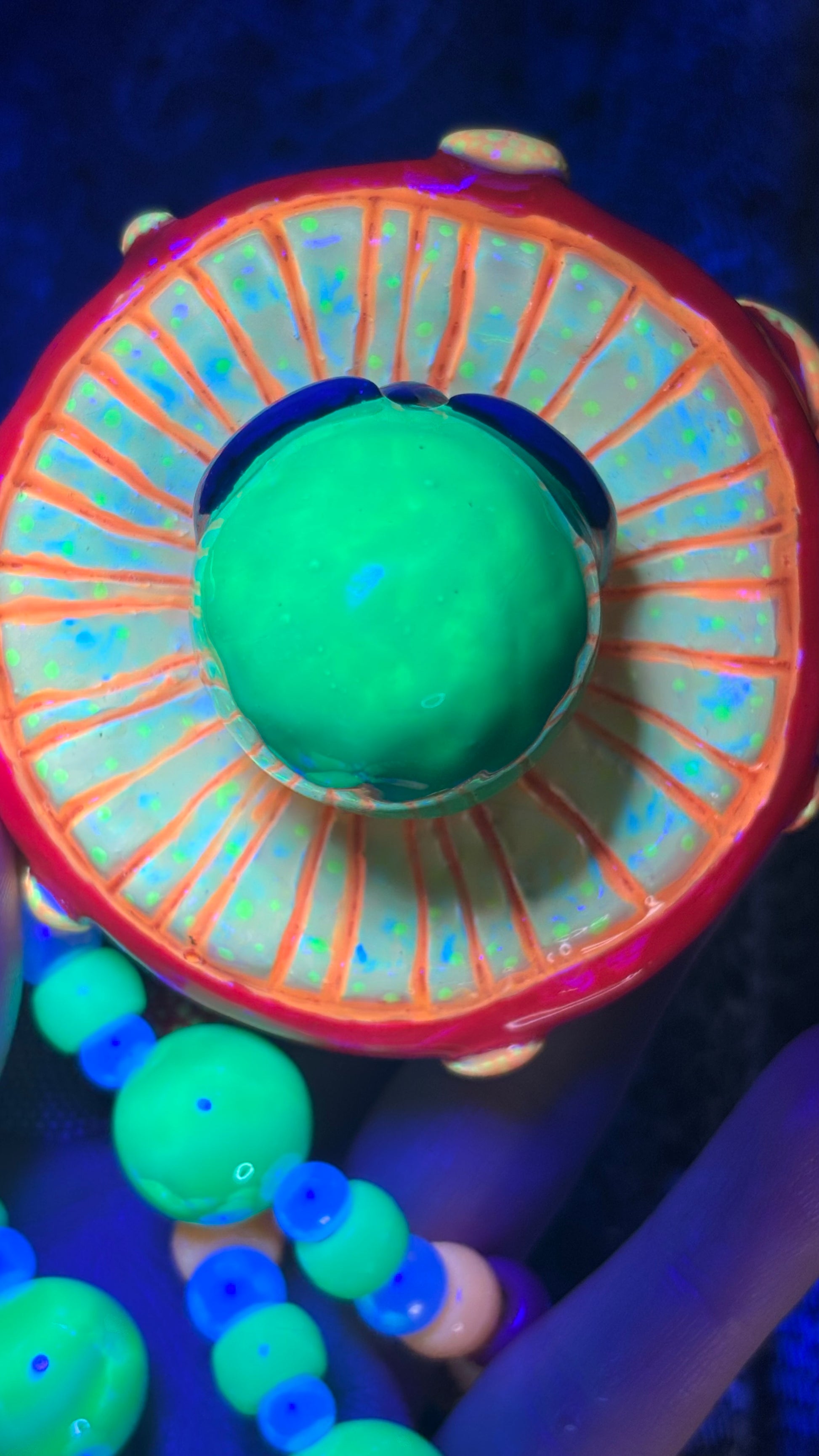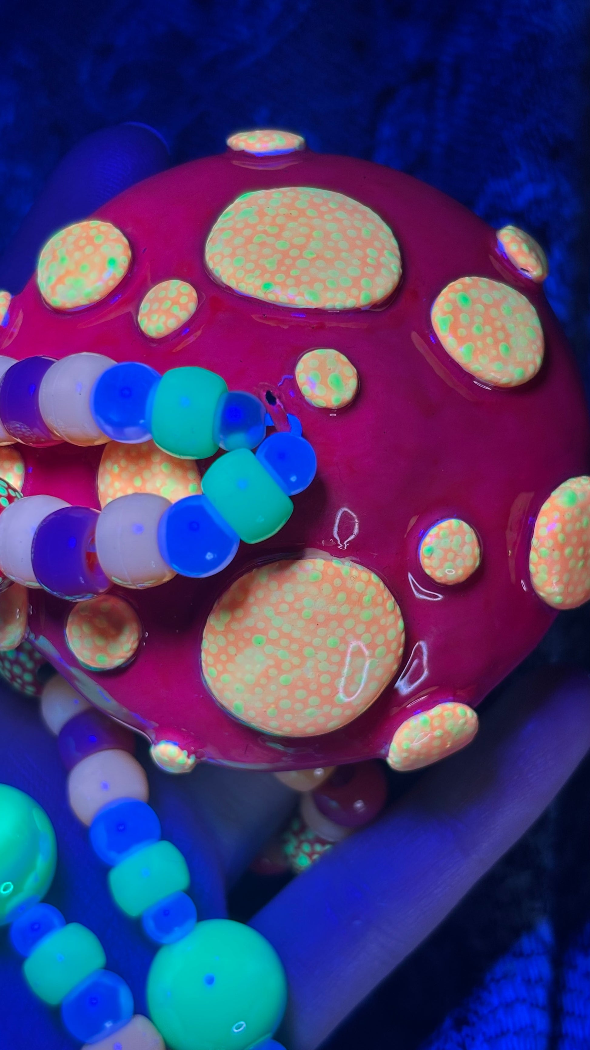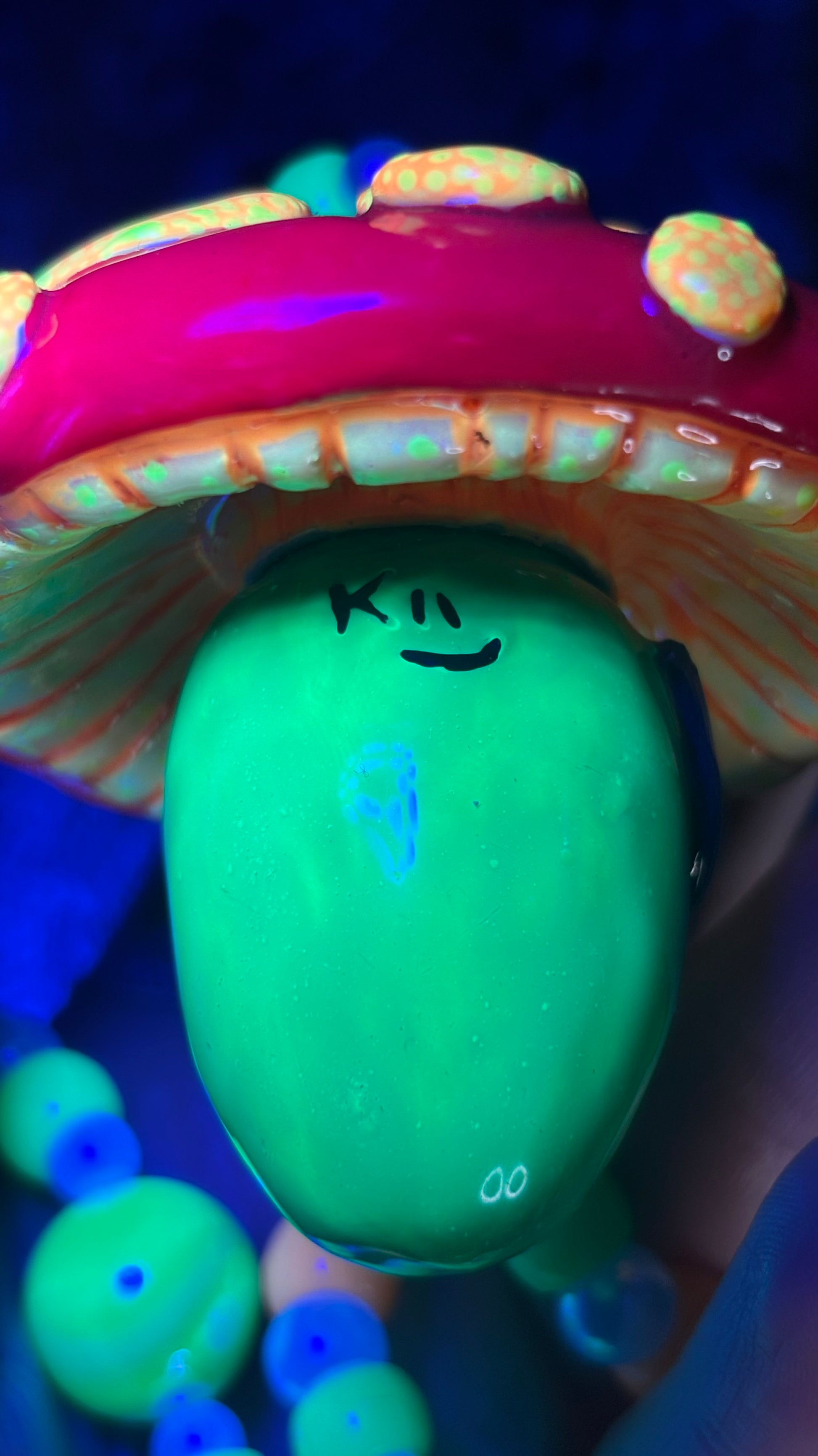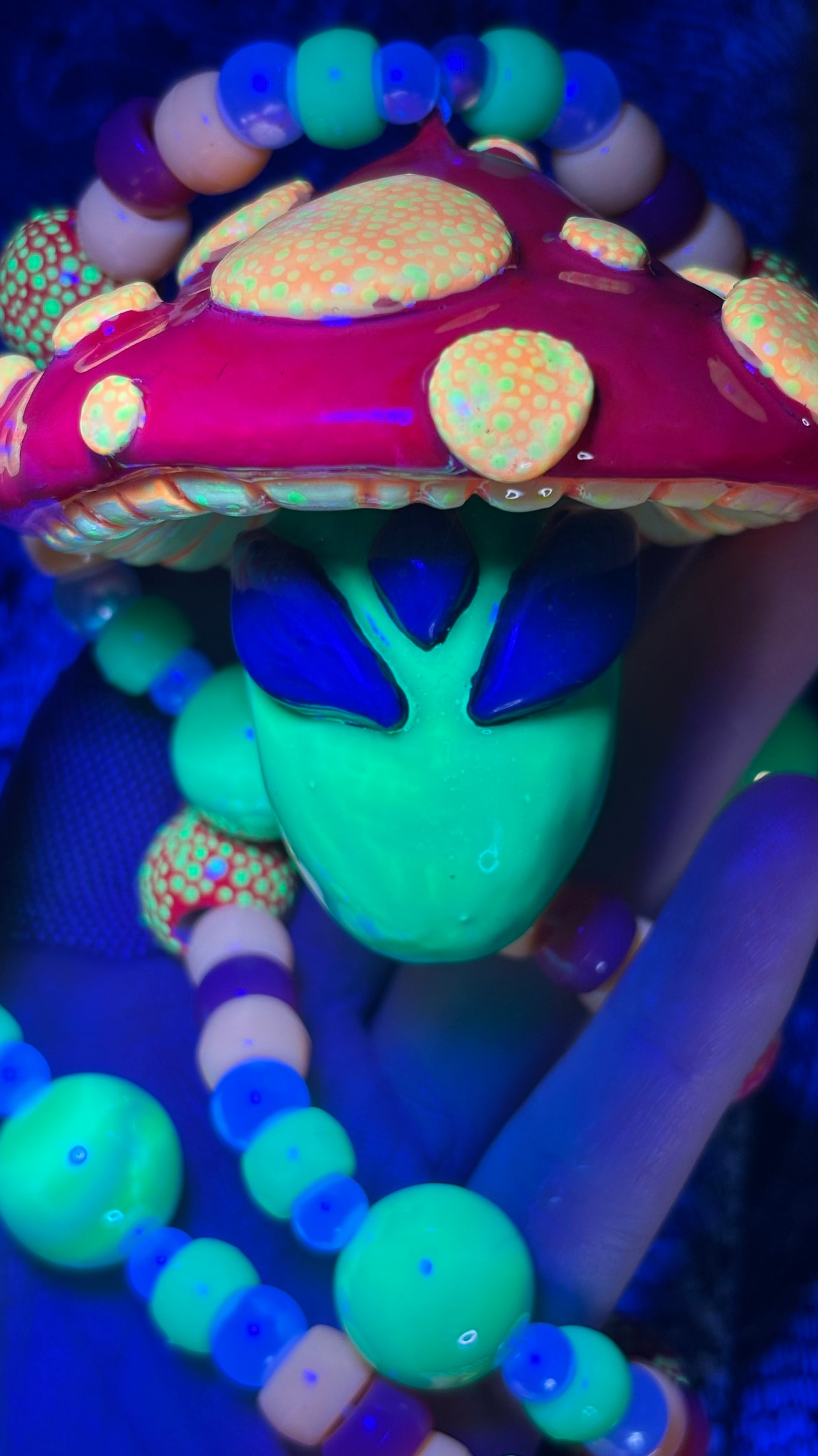 Hand sculpted out of polymer clay, painted with blacklight paints and sealed with UV Resin. Includes custom hand painted wooden beads with this stash jar.