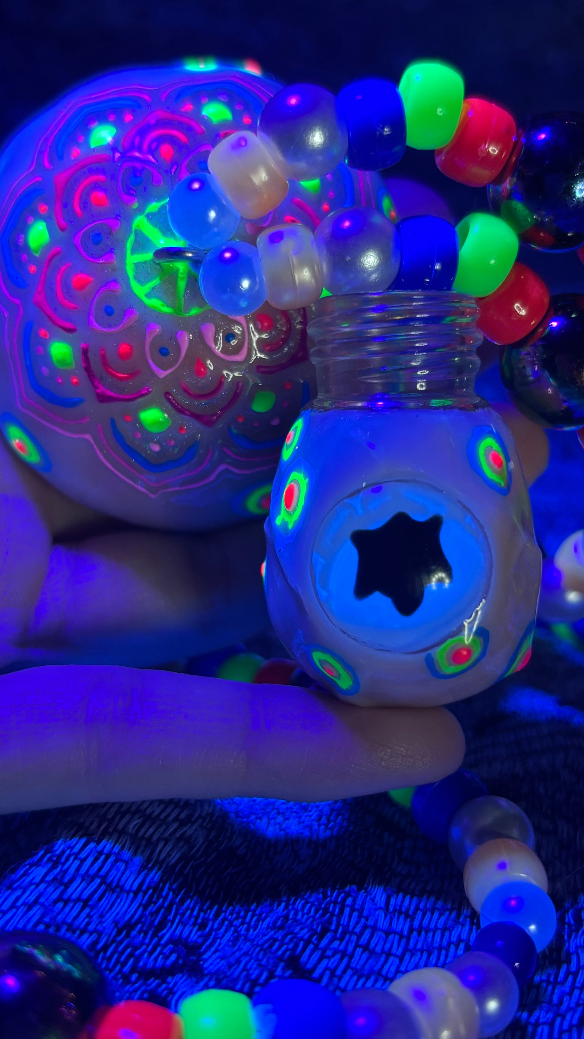 Hand sculpted out of polymer clay, painted with blacklight paints and sealed with UV Resin.