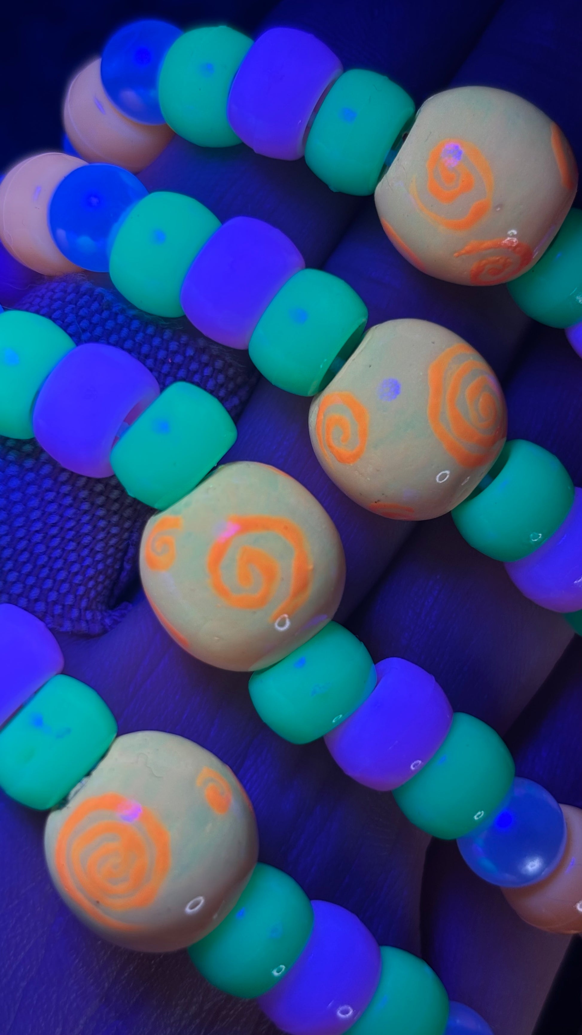 Hand sculpted out of polymer clay, painted with blacklight paints and sealed with UV Resin. Includes custom hand painted wooden beads with this stash jar.