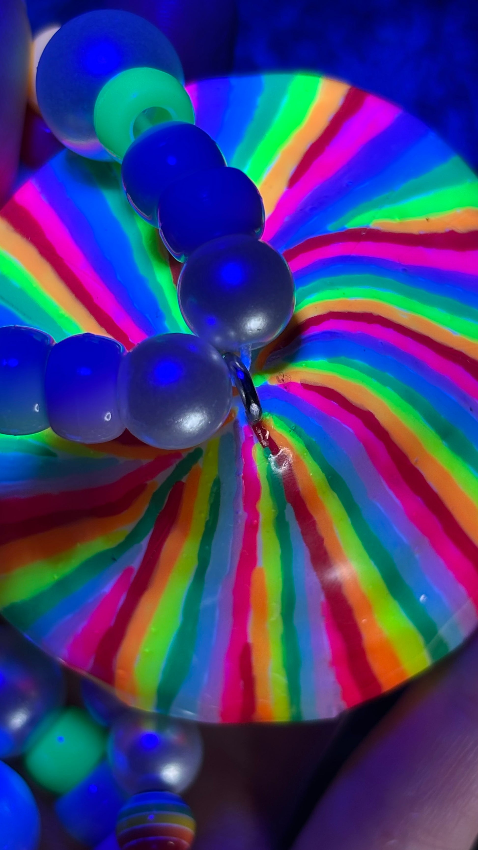 Hand sculpted out of polymer clay, painted with blacklight paints and sealed with UV Resin.